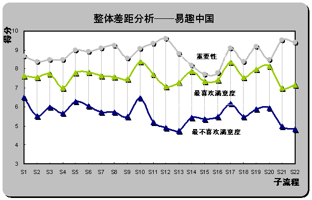 2) 重要流程欠缺最優(yōu)體驗(yàn)。雖然易趣中國(guó)被認(rèn)為是最不喜歡的在線銷售網(wǎng)站,但從滿意度評(píng)分也同時(shí)可以發(fā)現(xiàn),易趣中國(guó)在S1(瀏覽速度),S16(個(gè)人定制促銷信息的發(fā)布)和S15(個(gè)性化頁(yè)面設(shè)置)還是為用戶設(shè)計(jì)了相對(duì)較好的體驗(yàn)。但重要性得分排名前三位的子流程中,S12(產(chǎn)品質(zhì)量可靠)、S21(退換貨服務(wù))和S22(客戶投訴和反饋)仍為重要性與滿意度差距最大的三個(gè)子流程,易趣中國(guó)也未在重要流程上為用戶設(shè)計(jì)優(yōu)越的在線體驗(yàn)。