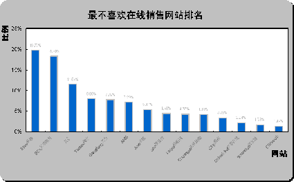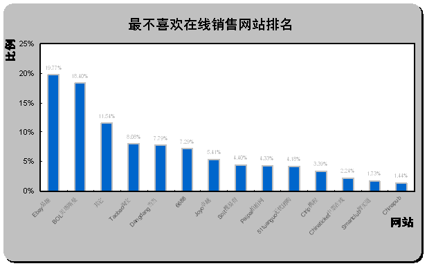 易趣中國(guó)和貝塔斯曼最不受歡迎。從最不喜歡在線銷售網(wǎng)站排名(如上圖)可以看出,易趣中國(guó)eBay