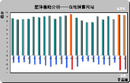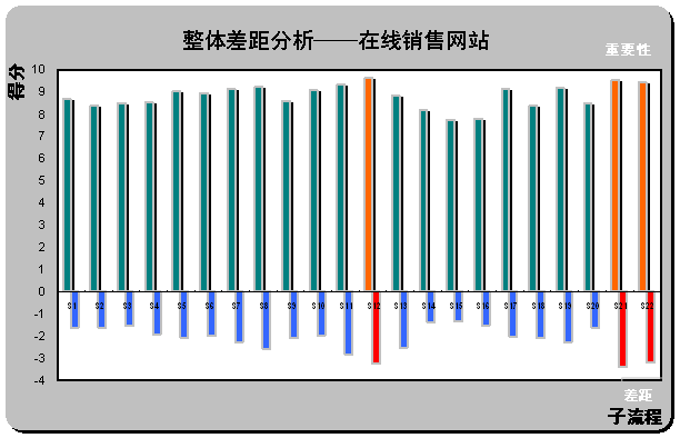 。2)整體差距分析(Gap Analysis)。請(qǐng)見上圖X軸下方所示,計(jì)算所有被調(diào)查對(duì)所列在線銷售網(wǎng)站的滿意度平均值(綜合最喜歡在線銷售網(wǎng)站和最不喜歡在線銷售網(wǎng)站的滿意度,計(jì)算被調(diào)查者對(duì)22個(gè)子流程的滿意度評(píng)分)。通過計(jì)算重要性和滿意度的差距,首先,一個(gè)有趣的現(xiàn)象,在著色的三個(gè)差距最大的子流程剛好也是重要性得分排名前三位的流程S12,