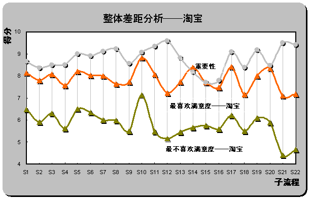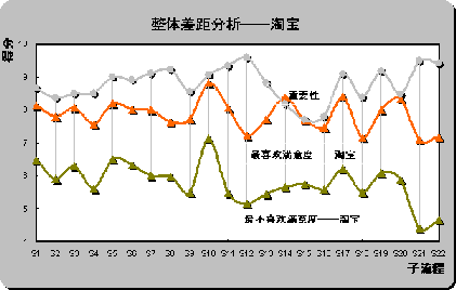 S12(產(chǎn)品質(zhì)量可靠)和S22(客戶投訴和反饋),具體差距分別為2.44,2.38和2.22。也是重要性評(píng)分排名前三位的子流程。雖然淘寶成為用戶最喜歡的在線銷售網(wǎng)站,但在重要子流程上并未為用戶設(shè)計(jì)最佳體驗(yàn)。