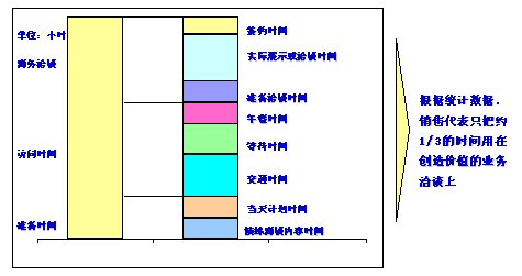 銷(xiāo)售資源是有限的,如何合理分配資源并確保最大的客戶機(jī)會(huì)和客戶價(jià)值是一個(gè)關(guān)鍵的問(wèn)題。對(duì)于銷(xiāo)售代表,個(gè)人的時(shí)間是寶貴的資源。根據(jù)統(tǒng)計(jì)數(shù)據(jù),銷(xiāo)售人員只把約1/3的時(shí)間用于增值的業(yè)務(wù)洽談上,這意味著在銷(xiāo)售人員的時(shí)間管理上有很大的提升空間。如圖3-1所示。