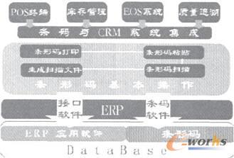 條碼技術(shù)的成熟使企業(yè)可以大范罔地得到應(yīng)用,充分解決企業(yè)管理系統(tǒng)中海量數(shù)據(jù)的管理和采集的難題,把條碼技術(shù)與CRM進(jìn)行無(wú)縫集成,為企業(yè)的ERP打下基礎(chǔ),具體集成框架圖如圖2。