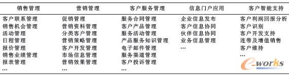 CRM應用系統(tǒng)功能平臺對應于平臺架構中的應用功能層,是系統(tǒng)平臺的卞體部分;趯企業(yè)的需求分析及B/S的平臺架構特點,筆者將系統(tǒng)功能綜合歸納為銷信管理、營銷管理、客戶服務管理、信息門戶應用及客戶智能支持5大模塊,它們共同構成的系統(tǒng)的功能平臺如圖2所示,詳細功能設計如表1所示。