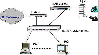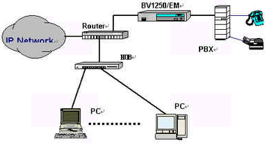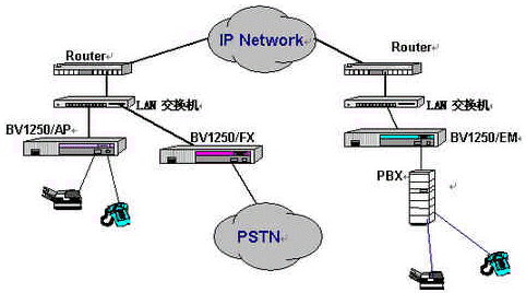 OKI公司的IVG BV1250互聯(lián)網(wǎng)絡(luò)IP電話(huà)語(yǔ)音網(wǎng)關(guān)就是一種非常好的選擇,完全基于H.323 Ver2.0協(xié)議,實(shí)現(xiàn)語(yǔ)音和傳真在因特網(wǎng)上傳輸。使用BV1250 進(jìn)行IP電話(huà)和IP FAX通信時(shí),可以感覺(jué)到與傳統(tǒng)的電話(huà)或傳真所提供的服務(wù)毫無(wú)區(qū)別。運(yùn)用BV1250,可通過(guò)互聯(lián)網(wǎng)(Internet/Intranet)將電話(huà)機(jī)、傳真機(jī)和PBX進(jìn)行互連,建立專(zhuān)用的IP電話(huà)網(wǎng)絡(luò)。BV1250使用的是靜態(tài)IP地址,因此不能將BV1250連接到使用DHCP(動(dòng)態(tài)主機(jī)通信規(guī)程)的互聯(lián)網(wǎng)上。常用連接方式如下圖所示: