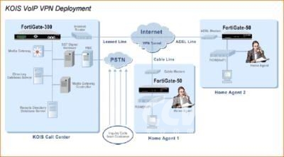 KOIS利用FortiGate網(wǎng)絡(luò)安全網(wǎng)關(guān)在保持所需要的性能級(jí)別和系統(tǒng)需求的基礎(chǔ)上全面保護(hù)了VPN的數(shù)據(jù)網(wǎng)絡(luò)。FortiGate-300網(wǎng)絡(luò)安全網(wǎng)關(guān)安全在呼叫中心,F(xiàn)ortiGate-50安裝在每個(gè)家庭代理中。