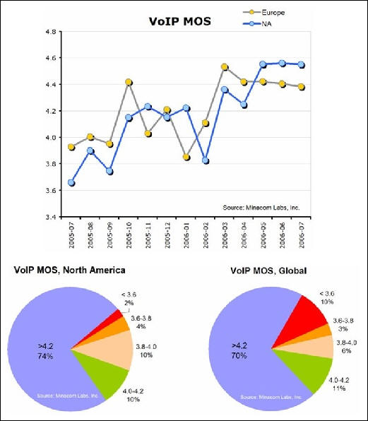 Minacom最新調(diào)研表明,一年來VoIP電話質(zhì)量和聯(lián)結(jié)速度都超過傳統(tǒng)標(biāo)準(zhǔn)公共開關(guān)電話。電話質(zhì)量得分Mean Opinion Score (MOS)數(shù)據(jù)表明,VoIP得分是4.2,而標(biāo)準(zhǔn)公共開關(guān)電話得分3.9。85%的IP電話質(zhì)量和穩(wěn)定性都超過標(biāo)準(zhǔn)公共開關(guān)電話。對電話聯(lián)結(jié)速度,VoIP的MOS得分是平均8.2秒,傳統(tǒng)電話時(shí)間更長,平均為8.9秒。這里的IP電話服務(wù)指商業(yè)企業(yè)級應(yīng)用,不是MSN,雅虎通之類免費(fèi)IP電話個(gè)人應(yīng)用。比較而言,北美IP電話質(zhì)量優(yōu)于歐洲。
