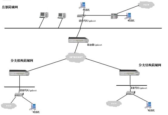 首先將VOIP電話網(wǎng)關(guān)的網(wǎng)絡(luò)接口接入到公司和分部(分公司)的局域網(wǎng)中,通過ADSL、ISDN、撥號上網(wǎng)等方式,同連接在此因特網(wǎng)上的其它VOIP電話網(wǎng)關(guān)相連,從而將不同地域的電話連接在一起,組成整個公司的IP電話網(wǎng),如果總部或分部有用戶程控交換機(jī),還可以將VOIP電話網(wǎng)關(guān)接入程控交換機(jī),使得整個交換機(jī)的分機(jī)都能利用IP網(wǎng)絡(luò)撥打免費電話。如果這個VOIP設(shè)備具有PBX的功能。那么電話網(wǎng)關(guān)的多種接口還可以與電信(PSTN)相連,從而將專網(wǎng)的IP電話語音網(wǎng)與整個公網(wǎng)銜接成一個大的電話網(wǎng)絡(luò)。