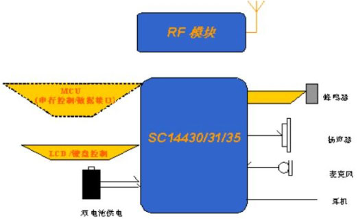 DECT的座機(jī)部分可以根據(jù)應(yīng)用,選擇配置采用獨(dú)立模式或外接MCU的模式工作,方便用戶靈活擴(kuò)展功能。外接MCU通過RS232口或SPI口與基帶處理器SC14438/37/35連接,實(shí)現(xiàn)控制/數(shù)據(jù)的交互。