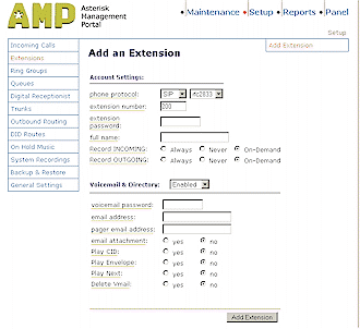 設(shè)置好中繼后,現(xiàn)在AAH就與你的VoIP服務(wù)提供商建立好連接了,接下來(lái)就是使用“Add an Extension”頁(yè)面(圖5)來(lái)設(shè)置你的電話(huà)了,每一個(gè)Extensions選項(xiàng)必需指定一個(gè)名字、數(shù)字和密碼,還可隨意給它指定一個(gè)語(yǔ)音信箱的目錄。