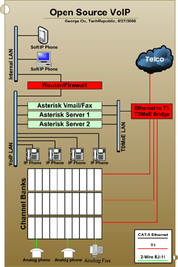 TDMoE(基于以太網(wǎng)的時分復(fù)用)LAN段負(fù)責(zé)PBX-語音郵箱和PBX-信道處理單元的通信。在過去,這些設(shè)備間的TDM通信使用昂貴的T1卡,但是通過將TDM通信搬到廉價的以太網(wǎng)上,這一點已經(jīng)得到極大的改善。