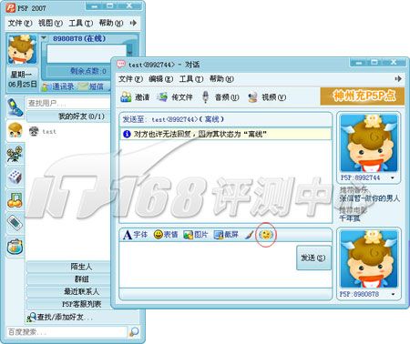 P5P和酷寶很類似,不過它沒有集成MSN,僅是在界面上模仿MSN,文本聊天框就是MSN翻版,MSN經(jīng)典的閃屏震動(dòng)功能也有。P5P還在在好友列表上加進(jìn)了一些QQ的元素。