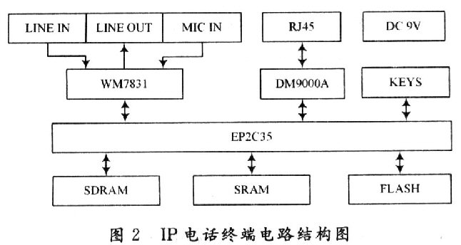 根據(jù)1P電話終端的硬件需求,為該終端配置了音頻接入口、音頻編解碼芯片WM8731;網(wǎng)絡(luò)接口芯片DM9000A;存儲(chǔ)器IC42S16400;主控制器EP2C35;直流電源9 V,如圖2所示。