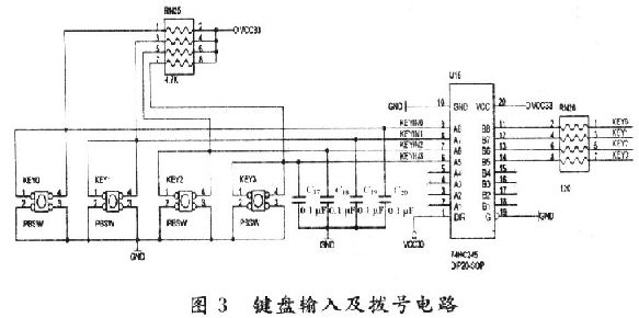 為實(shí)現(xiàn)IP電話與普通電話的通用性,該終端加入鍵盤(pán)模塊,按鍵開(kāi)關(guān)KEY0~KEY9,KEY_X,KEY_Y,KEY_ON,KEY_OFF(其中,除KEY_ON和KEY_OFF是鎖閉式按鍵外,其余均為非鎖閉式按鍵)采用行列掃描式接法,加入了74HC245總線收發(fā)器作為緩沖器,電路如圖3所示(由于按鍵過(guò)多,圖中僅給出KEY0~KEY3電路)。
