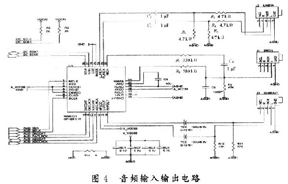 音頻輸入及編解碼電路是通過(guò)Wolfson公司的WM8731編解碼器(編碼器和解碼器)實(shí)現(xiàn)的。它可以提供高質(zhì)量的24b/s音頻,由一系列的I2C總線接口控制,這些接口連接到Cyclone II FPGA的引腳上。硬件電路如圖4所示。