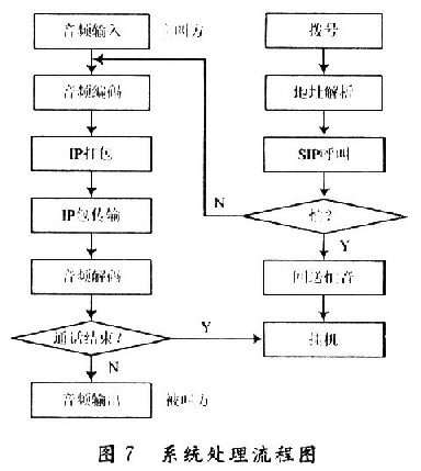 當(dāng)撥號(hào)確認(rèn)后,主控制器對(duì)編解碼器發(fā)送控制指令,開(kāi)始語(yǔ)音A/D轉(zhuǎn)換,并進(jìn)行編碼,送到片外存儲(chǔ)器內(nèi)進(jìn)行緩存;Nios CPU對(duì)撥號(hào)信息的解析確定。目的地址,通過(guò)Avalon總線對(duì)以太網(wǎng)接口發(fā)送數(shù)據(jù)傳輸指令;將符合以太網(wǎng)標(biāo)準(zhǔn)的數(shù)據(jù)從片外存儲(chǔ)器內(nèi)讀出,送入Internet中,返回確認(rèn)信息。系統(tǒng)處理流程圖如圖7所示。