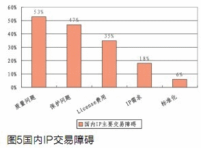 根據(jù)我們對(duì)92家芯片設(shè)計(jì)企業(yè)的問卷調(diào)查,IP質(zhì)量、IP保護(hù)和IP費(fèi)用是目前國(guó)內(nèi)IP核交易中的主要障礙。(見圖5)