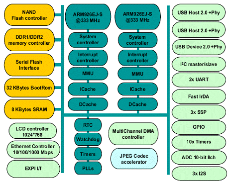 926EJ-S core, two USB 2.0 hosts, one USB 2.0 device port and a Giga-Ethernet