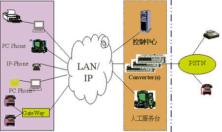 如圖點劃線左邊所示,IP PBX系統(tǒng)通過在網(wǎng)絡中加入控制中心并利用原有網(wǎng)絡的結點(多媒體配置),將LAN改造為PBX電話網(wǎng)絡。IP