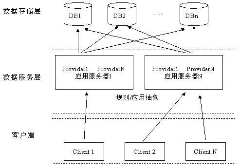 各種業(yè)務均有邏輯上獨立的應用服務器,每個應用服務器從性能和安全的角度考慮,可能含有兩個以上獨立的物理點,而每個物理點上又可能含有兩個以上的邏輯服務提供點(Provider),這意味著在應用服務器中存在這樣一個判斷規(guī)則(或服務),當發(fā)現(xiàn)一個邏輯點存在性能或安全障礙時,系統(tǒng)動態(tài)創(chuàng)建另一個邏輯服務提供點。每一個邏輯服務提供點(Provider)可能與數(shù)據(jù)庫只有一個連接,即多個用戶在數(shù)據(jù)庫服務器端只有一個Session,從而大大節(jié)約系統(tǒng)開支。系統(tǒng)結(jié)構(gòu)如下圖所示: