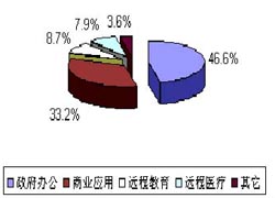 視頻會(huì)議系統(tǒng)在我國(guó)開(kāi)始發(fā)展的初期,政府部門(mén)的應(yīng)用就占據(jù)了重要位置,覆蓋中央到直轄市和各省會(huì)城市的國(guó)家公眾視頻會(huì)議骨干網(wǎng)已經(jīng)完工。自1994年9月投入使用以來(lái),國(guó)務(wù)院等機(jī)關(guān)先后利用該網(wǎng)召開(kāi)了三百多次全國(guó)范圍的可視通訊會(huì)議。整個(gè)系統(tǒng)運(yùn)行情況良好,得到了國(guó)家領(lǐng)導(dǎo)人和各部委領(lǐng)導(dǎo)的高度贊揚(yáng)。近年來(lái)隨著電子政務(wù)工程的逐步推進(jìn),政府部門(mén)更加關(guān)注視頻會(huì)議系統(tǒng)建設(shè)。在經(jīng)濟(jì)發(fā)達(dá)地區(qū)(例如浙江、山東、廣東),視頻會(huì)議網(wǎng)已覆蓋到地市級(jí)城市,有的甚至覆蓋到縣一級(jí)。除各級(jí)政府之外,其它諸如檢察院、法院、公安和和水利等職能部門(mén)也是視頻會(huì)議系統(tǒng)的重要用戶(hù)。如圖1所示,政府辦公已占全部市場(chǎng)份額的46.6%。