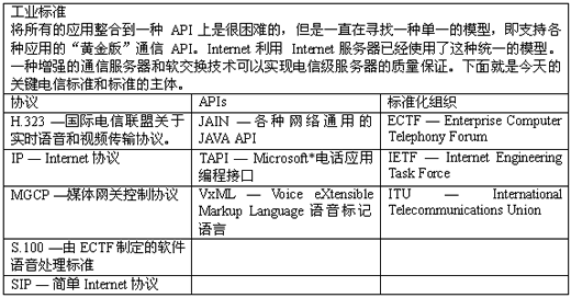 如今我們可以看到這種趨勢(shì)的例子。新一代的有競(jìng)爭(zhēng)力的業(yè)務(wù)提供商正在利用在綜合網(wǎng)絡(luò)中像語(yǔ)音門戶,統(tǒng)一消息,和v_Business這些領(lǐng)域中涌現(xiàn)出來(lái)的機(jī)會(huì)。這些業(yè)務(wù)提供商還用像個(gè)人助理,Internet會(huì)議,以及Internet呼叫等待這樣一些耳熟能詳?shù)膽?yīng)用在Internet上推出了下一代服務(wù)。