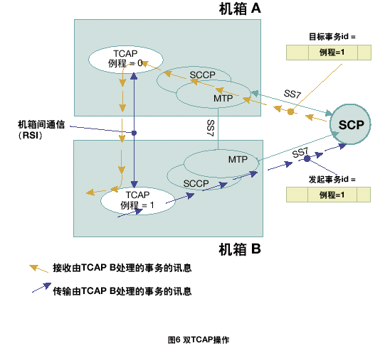 每個(gè)TCAP將所有接收的信息傳遞到同機(jī)箱中的TCAP用戶任務(wù)中。根據(jù)每一個(gè)TCAP中不同的應(yīng)用層或用戶,將TCAP層的本地應(yīng)用程序發(fā)送的傳送會(huì)話和組件原語傳遞給正確的TCAP。在雙系統(tǒng)環(huán)境中,接收訊息可以在任何MTP和SCCP層上共享;因此,一個(gè)TCAP層接收由其它TCAP處理的應(yīng)用在激活事務(wù)上的TCAP訊息是可能的。