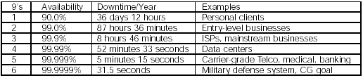 正如表中建議的那樣,實(shí)用性尤其在非常接近1的區(qū)間內(nèi)才被討論。盡管99%的正常運(yùn)行時(shí)間看起來很好,它仍然將導(dǎo)致每年超過3天半的故障時(shí)間。大部分方案不會被認(rèn)為是高可用的,直到它們接近99.9%的運(yùn)行時(shí)間--大概每年9個(gè)小時(shí)的故障時(shí)間。但是,通信行業(yè)使用4個(gè)9級別到5個(gè)9級別范圍的實(shí)用性。