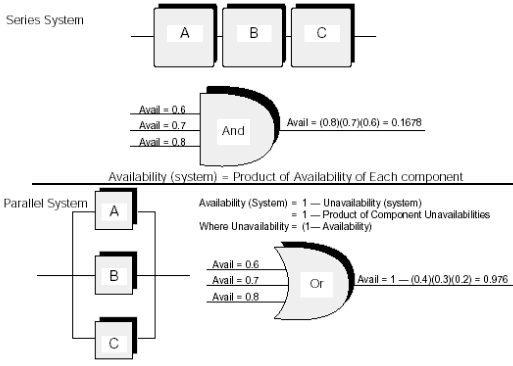 由于冗余被引入系統(tǒng),系統(tǒng)的可用特性發(fā)生了重大的改變。實(shí)用性計(jì)算變成了一種費(fèi)力并且容易出錯(cuò)的工作,因?yàn)橛?jì)算必須考慮冗余的效果,失效切換到冗余組件的成功率,MTTR失效組件的效率及相似的問題。使用平臺和電話板塊MTTF數(shù)據(jù)作為輸入和使用可靠模塊圖(RBD)2以正確決定系統(tǒng)級別可用特性可以獲得更好的結(jié)果。