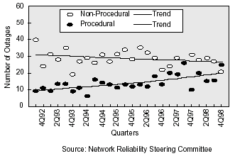 根據(jù)來自網(wǎng)絡(luò)可靠性指導(dǎo)委員會(NRSC)的研究,對于33%報(bào)告的業(yè)務(wù)中斷,程序出錯(cuò)是根本原因。程序中斷的頻率有上升的趨勢,正如在右面圖中顯示的那樣。