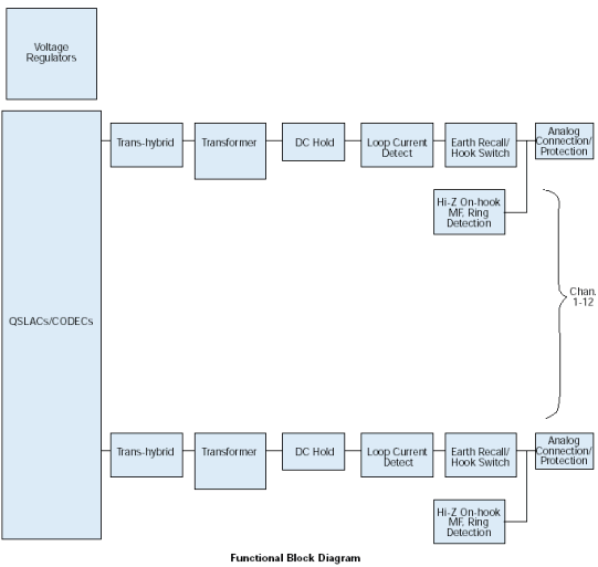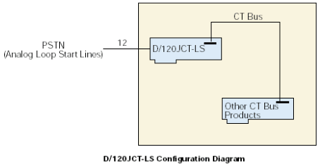 來自12個(gè)環(huán)路電話線的信號首先通過電話線路接口連接到D/120JCT-LS板卡上,該接口提供瞬變保護(hù)和電磁干擾(EMI)刪除(參見子板塊圖)。這些電話線路接口使用可靠的晶體摘掛機(jī)開關(guān)(無機(jī)械接觸)和FCC-Part