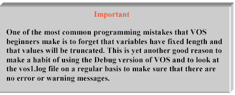 變量長度有限制,如果字符串的長度大于最大長度,則按最大長度取值。如果在調(diào)試模式下運行VOS,當(dāng)一個字符串被截短后會彈出一個警告信息。(如果要避免這些告警,賦值時使用substr函數(shù))