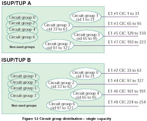 兩個(gè)系統(tǒng)中的電路組既可以從0開(kāi)始編號(hào),也可以兩個(gè)系統(tǒng)間隔標(biāo)號(hào)。如果使用第一種方法,整個(gè)系統(tǒng)的容量就是單ISUP/TUP協(xié)議層系統(tǒng)的容量的2倍,如果使用第二種方法,系統(tǒng)總?cè)萘颗c單ISUP/TUP協(xié)議層系統(tǒng)的容量相同。對(duì)于這兩種情況,每半部分控制對(duì)立的CIC范圍,如圖11和12所示: